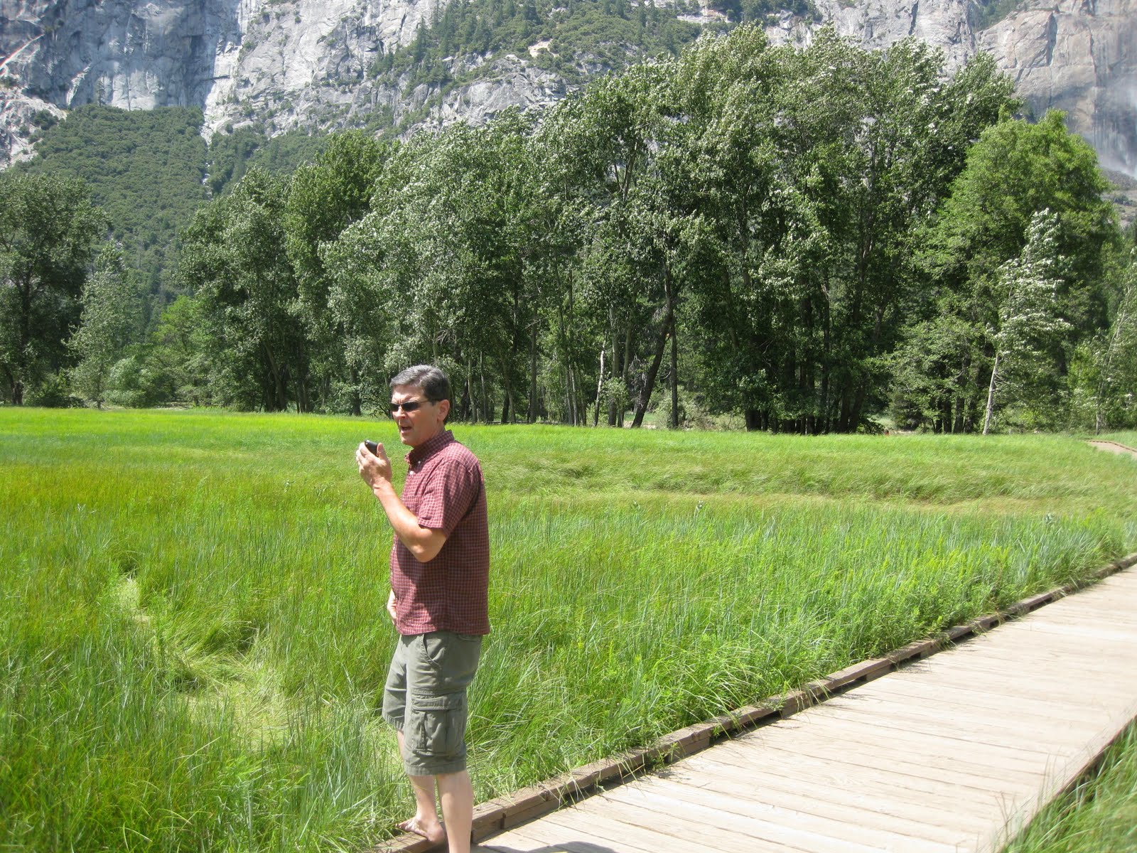 You've seen (and maybe been through) drive-through trees - this is a drive through rock near a southern entrance to that park. Very picturesque. We would have enjoyed it much more had we not already been in the car for 7 hours looking for a place to camp... At right you see me outstanding in my field. Actually, the meadow that is Yosemite Valley.