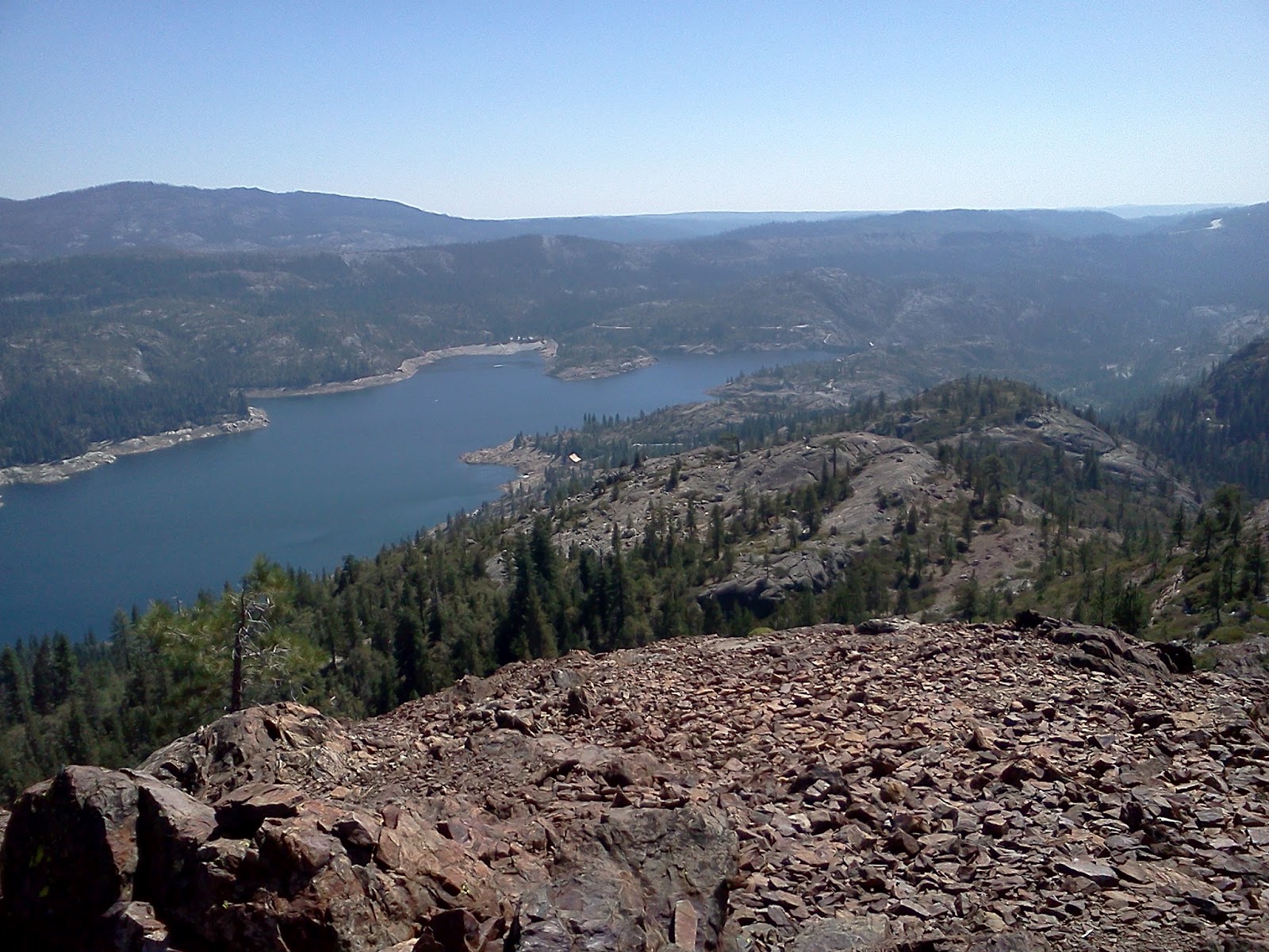 Mom and I decided to take the afternoon off and do a little hiking. We even took grandma, and while we ran up the hill and back, she sat down at the lake and put her feet in the water. The scene below looks Southwest and contains Lake Spaulding on the left and I-80 in the center background.